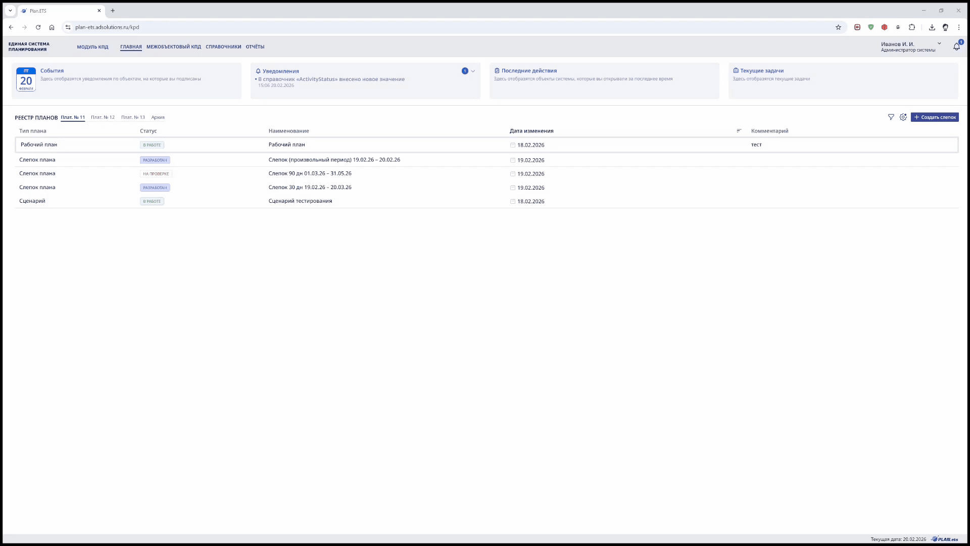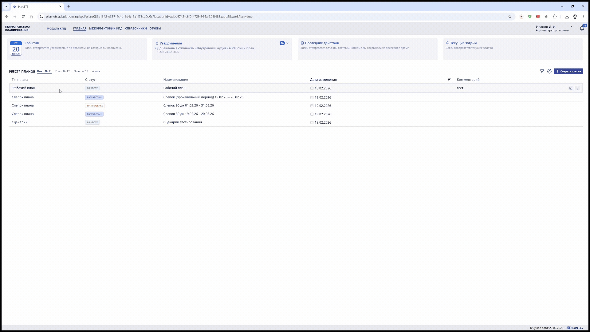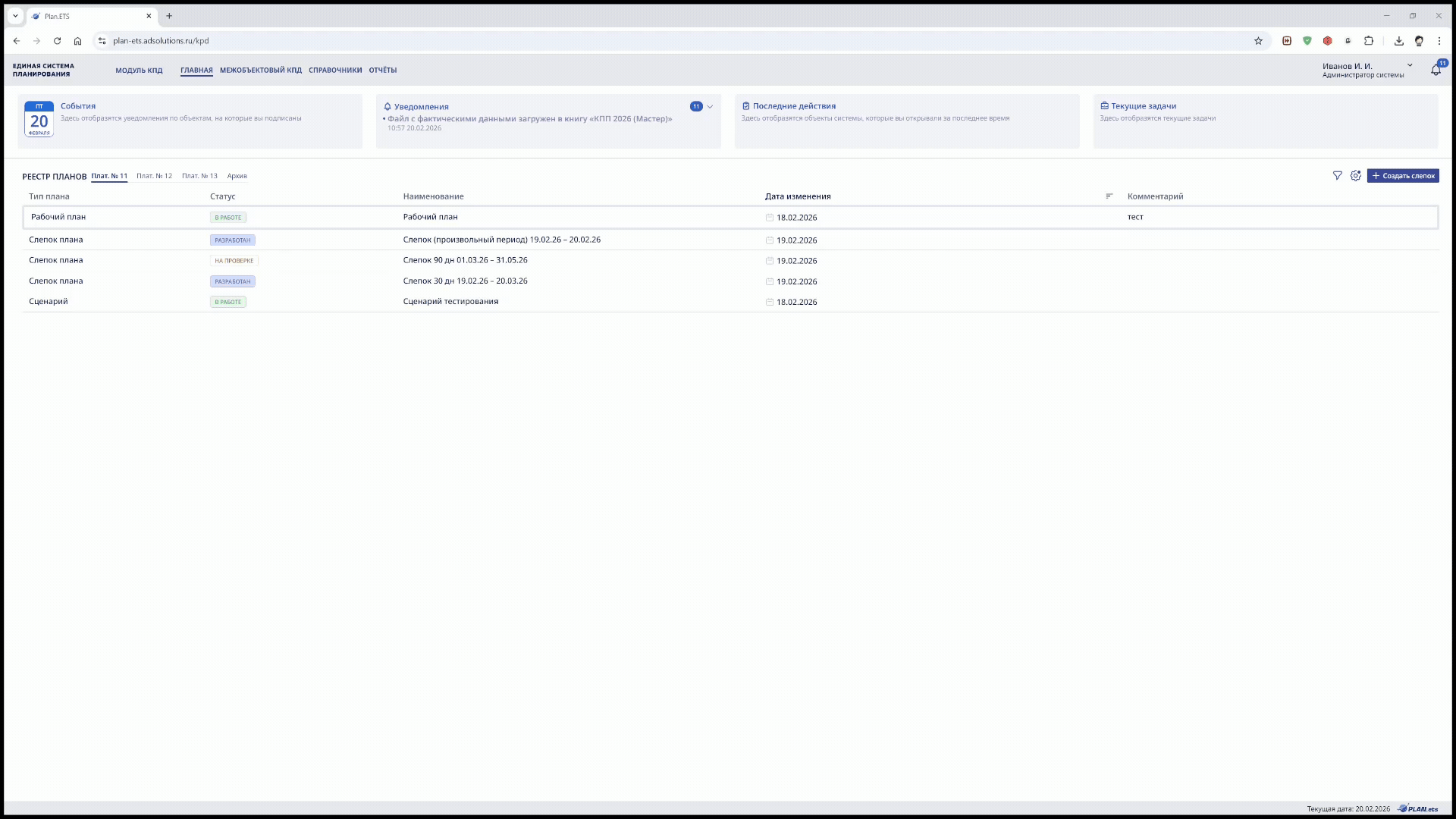 Централизованный учёт, мониторинг и контроль исполнения интегрированного плана, оперативное отслеживание статуса мероприятий и достижений целевых показателей.